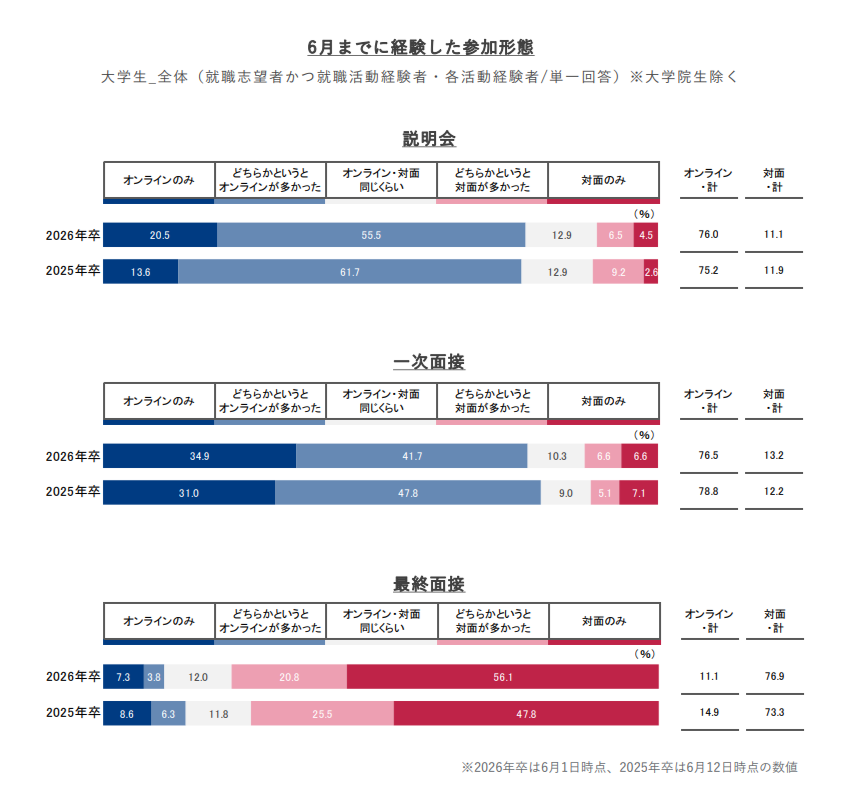 6月までに経験した参加形態について尋ねたところ、説明会と一次面接で「オンラインのみ」の回答が増加した。一方で、最終面接は「対面のみ」と回答した人が56.1%で最も多く、25卒と比較しても8.3ポイント増加する結果となった。