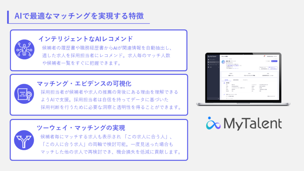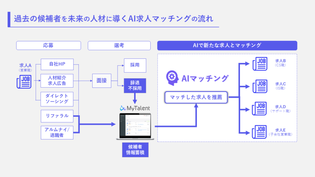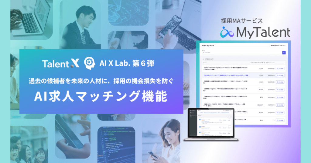 このような背景から株式会社TalentXは、同社が提供する採用MAツール「MyTalent」にAI求人マッチング機能を追加した。MyTalentは、求職者・潜在候補者のタレントプール構築から、アプローチの半自動化や採用活動の仕組み化まで一貫支援する採用MA(マーケティングオートメーション)ツールだ。