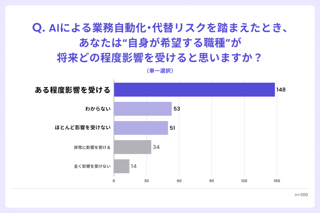 自身の希望する職種がAIによる業務自動化・代替リスクの影響をどの程度受けると思うか尋ねたところ、「ある程度影響を受ける」「非常に影響を受ける」の回答を合わせて、学生の約6割が「影響を受ける」と考えていることが明らかになった。