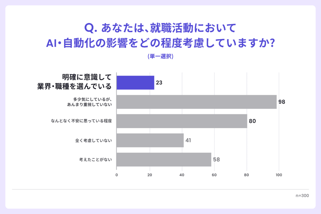 一方で、就職活動をする際にAIの影響を考慮しているか調査した結果、明確に意識している学生はわずか7%に留まった。