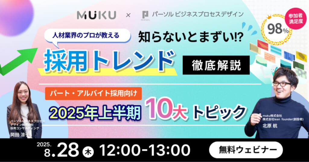 このような背景から同社は2025年8月28日、muku株式会社と共同で「2025年上半期アルバイト採用の全てが分かる!採用トレンド徹底解説」ウェビナーを開催する。同ウェビナーでは、採用競争から一歩抜け出すためのヒントを、採用トレンドの最新情報から解説していく。