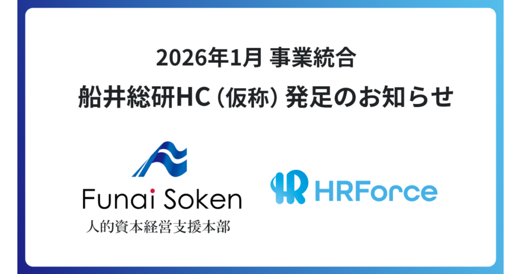 株式会社HR Forceは2026年1月1日、株式会社船井総合研究所(船井総研)の人的資本経営支援本部と事業を統合し、新たに「船井総研HC(仮称)」を発足すると発表した。