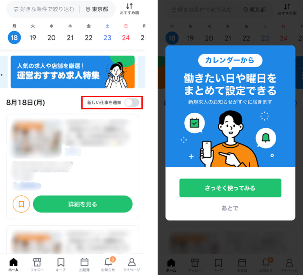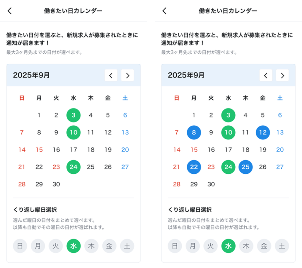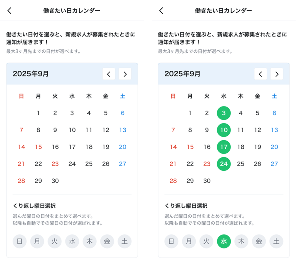 これまでも、特定の日を通知設定することで求人情報を受け取れる仕組みがありましたが、数週間先の通知設定には手間がかかる課題がありました。同社が実施した利用調査でも「先の日程でも簡単に通知を受け取りたい」という声が多く寄せられていたといいます。