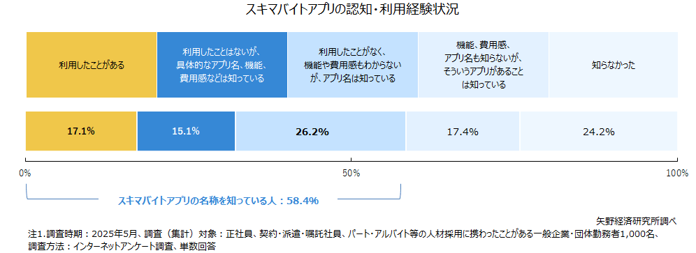 このような背景から、株式会社矢野経済研究所は人材採用に携わったことがある人1,000名を対象に、スキマバイトアプリの活用状況に関するアンケート調査を実施した。
