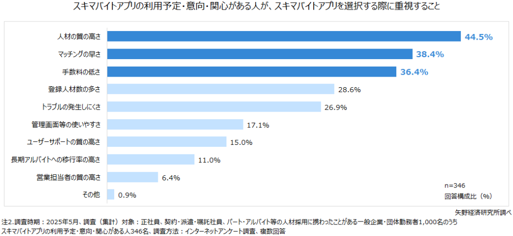 スキマバイトアプリの利用経験は無いが、スキマバイトアプリの利用予定・意向・関心がある346名に対し、スキマバイトアプリを選択する際に重視する点を尋ねたところ、最も多かったのは「人材の質の高さ」で44.5%、次いで「マッチングの確実さ」が38.4%、「仕事内容の充実」が36.4%であった。