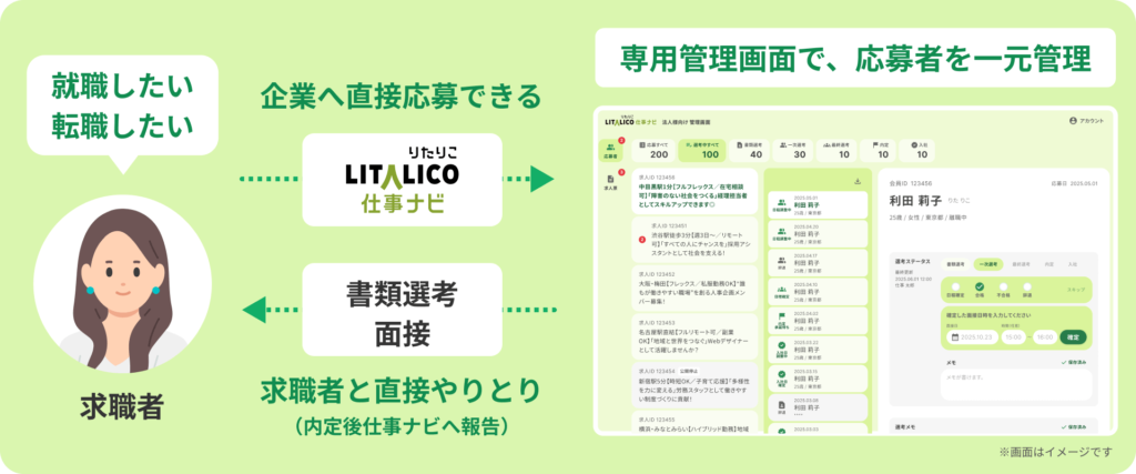 新サービスの特徴として、全国どの地域からでも掲載可能で、地元の求職者に加え、U・Iターン、リモート人材など企業の採用選択肢を戦略的に拡大することが可能である。完全成功報酬型のため始めやすく、採用時には人材紹介より安価な想定年収に対して一律10%の手数料で利用することができる。また、就労支援事業所との直接連携により応募者の一元管理機能を提供し、LITALICOが培ってきたノウハウを活かした採用活動、選考、定着等に必要な情報をワンストップで得られるコンテンツを搭載される予定だ。