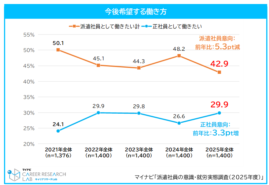 今後希望する働き方について、「派遣社員」として働くことを希望する割合は42.9%で前年から5.3ポイント減少した。一方で、「正社員」を希望する割合は29.9%と前年から3.3ポイント増加している。