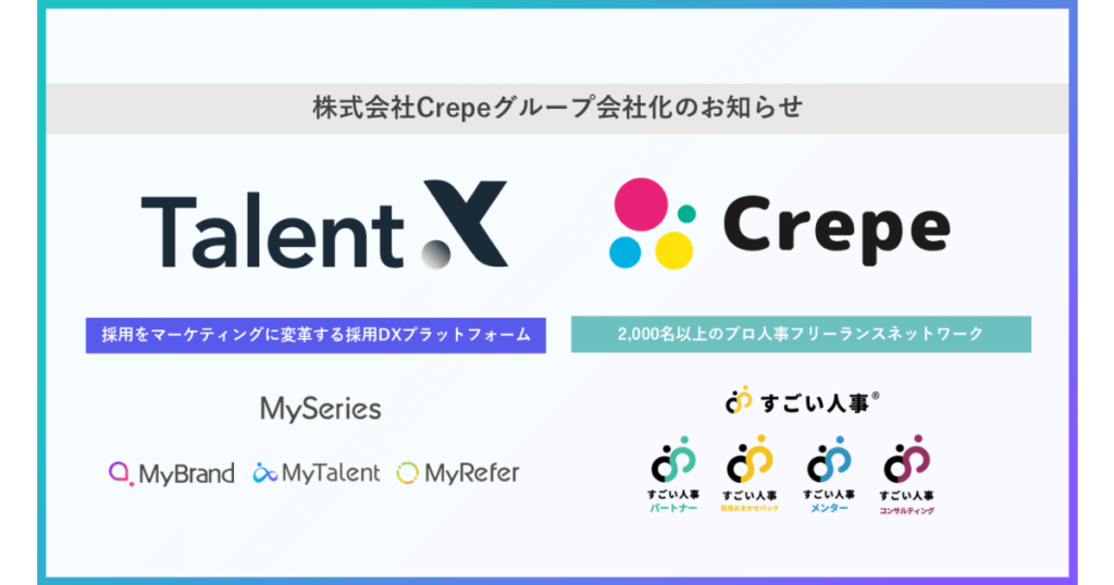 このような背景から、株式会社TalentXは「すごい人事シリーズ」を展開する株式会社Crepeの全株式を取得し、グループ会社化したことを発表した。