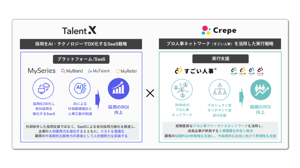 今回のグループ会社化により、TalentXの「プラットフォーム」とCrepeの「人事のプロフェッショナルサービス」が融合され、テクノロジーと人の知見を掛け合わせたハイブリッドなサポートを提供する。これにより、リソースが限られた企業にも高い実効性と再現性をもたらし、本質的な採用DXを推進していく。