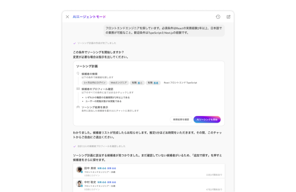 AIエージェントモードでは、チャット画面に採用要件や求めるスキルを入力すると、AIが最適な検索条件を作成する。Wantedlyですでに公開している自社の募集情報から条件を読み取り、自動で検索条件を生成することも可能だ。また、AIが作成した検索条件に基づく候補者リストをその場で確認でき、想定とずれがある場合はチャット上で条件の微調整が行える。