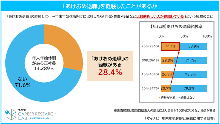 年明けの出社時に同僚等が退職していた「あけおめ退職」を経験したことがある人は28.4%だった。年代別で見ると、若い世代ほど経験率が高く、特に20代では41.1%に上る。