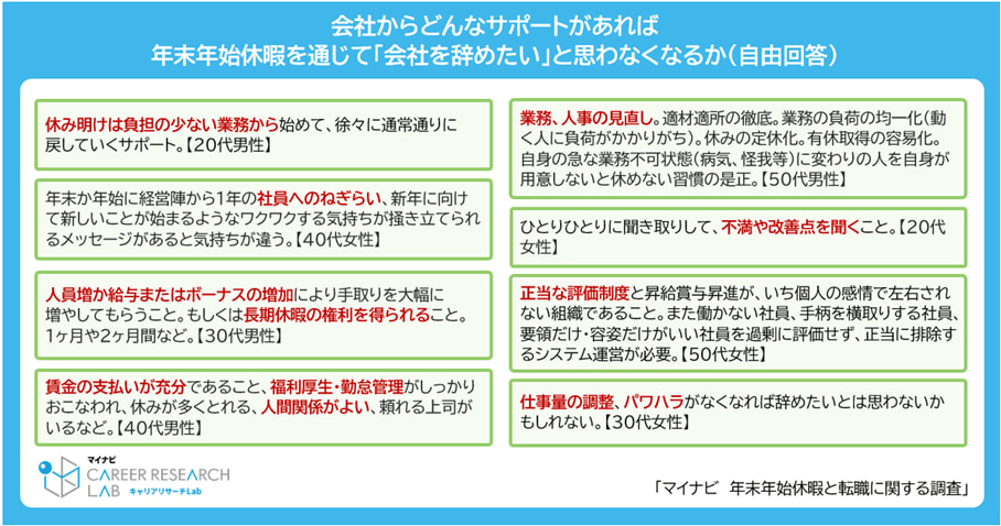年末年始休暇における「辞めたい気持ち」を緩和するために求められる会社のサポートとしては、「給与・ボーナスの増加」「福利厚生の充実」といった待遇面に加え、「業務負荷の均一化」「有休取得の容易化」「休暇明けは軽い業務から始める」などの業務面での配慮が挙げられた。
