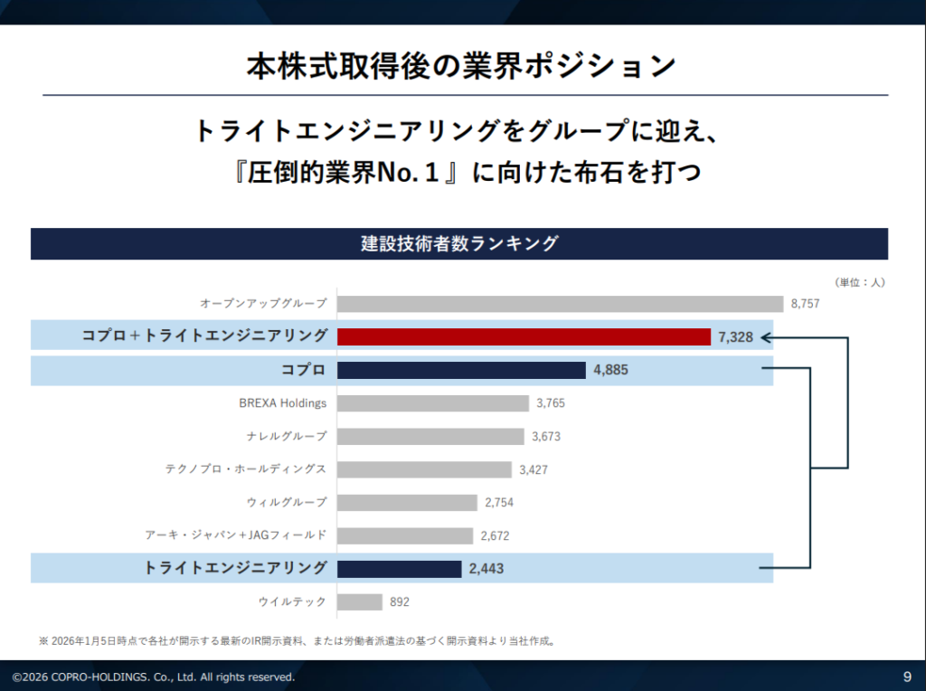 コプログループとトライトエンジニアの売上高を単純合算すると520億円規模に。建設技術者数ではオープンアップグループについで2番目に多くなる見込みです。建設派遣の勢力図が大きく変わる可能性がありますね!