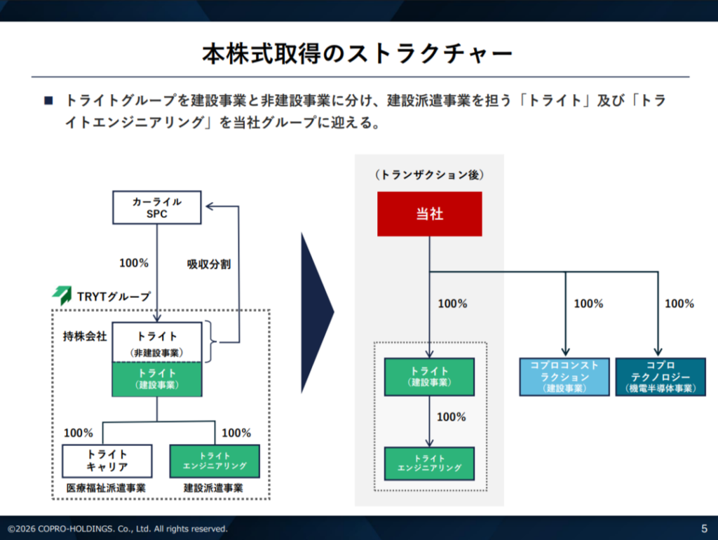 トライトグループでは大きく分けて医療福祉と建設の2つの事業を手掛けている。今回の株式取得では、建設派遣事業を担う「トライト」及び「トライトエンジニアリング」をコプログループに迎え、建設派遣以外の事業については、親会社のトライトキャリアが吸収分割で承継する。