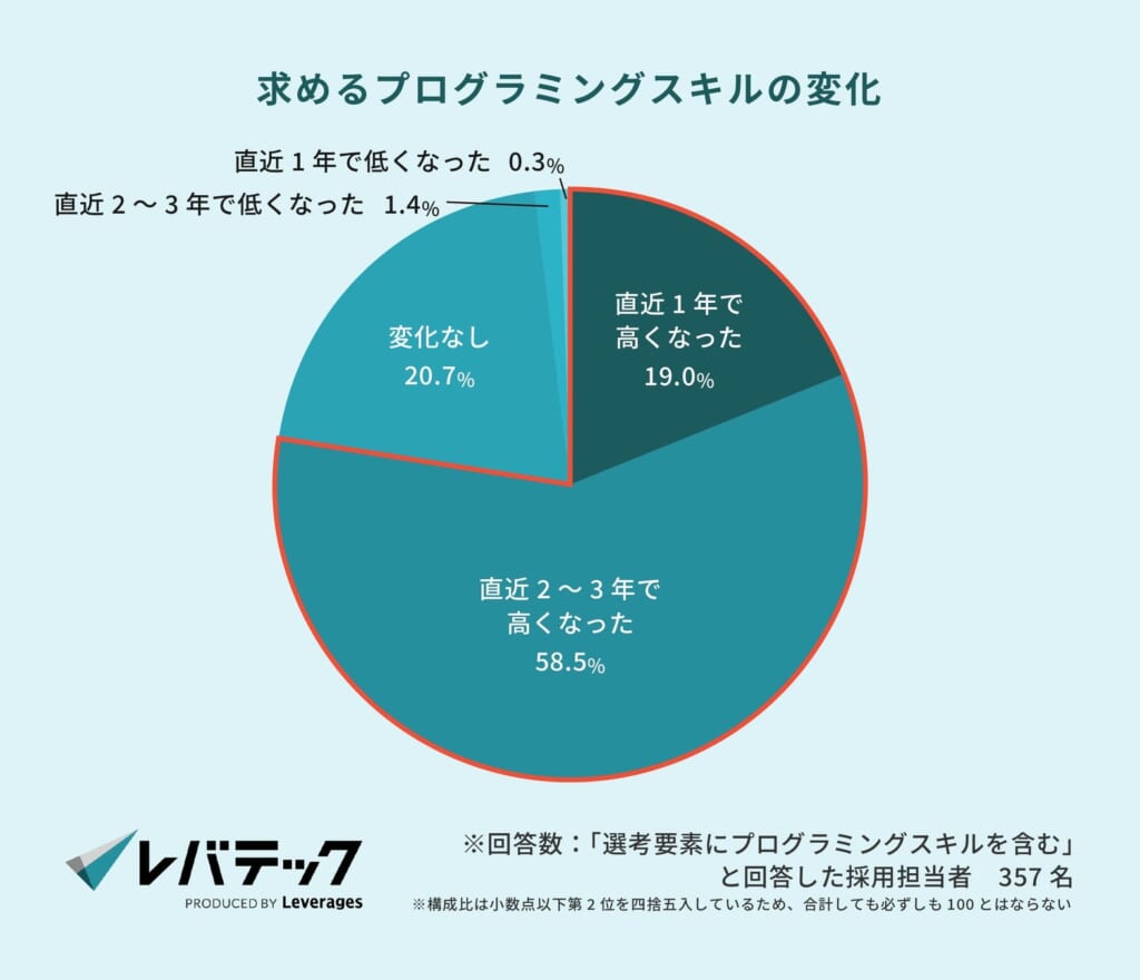 新卒採用を実施する企業の約7割が、選考要素に「プログラミングスキルを含む(73.8%)」と回答しました。また「過去3年以内に、求めるプログラミングスキルが高くなった(77.5%)」と回答した採用担当者も7割を超えています。小中高のプログラミング教育の必修化に加え、AIによる単純作業の自動化が進むことを背景に、より高度なスキルを持つ人材を求める企業が増加していると考えられます。