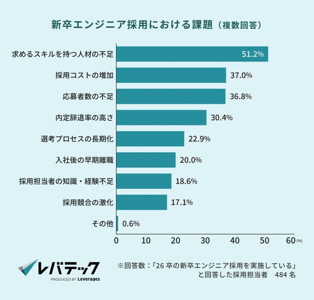 新卒エンジニア採用における課題については「求めるスキルを持つ人材の不足(51.2%)」が最も多く、「採用コストの増加(37.0%)」「応募者数の不足(36.8%)」「内定辞退率の高さ(30.4%)」が続きます。近年は少子化も影響し企業間の新卒採用競争が激化していることに加え、求められるスキルのレベルが上昇していることが、採用難に繋がっていると考えられます。