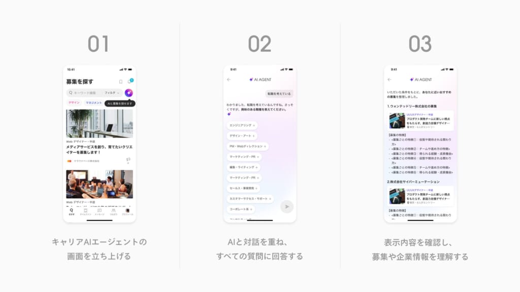 「キャリアAIエージェント」は、求職者がAIとの対話を通じて、自身の希望条件に合致する募集を探すことができるものです。