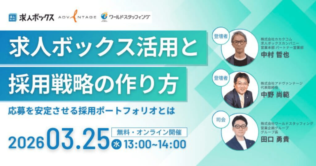 本セミナーでは、求人検索エンジン「求人ボックス」を運営するカカクコムと、採用マーケティング支援を行うアドヴァンテージが共同登壇。求人ボックスによる求職者集客の仕組みと、特定の求人検索エンジンや大手媒体に依存しない採用戦略の組み立て方を、実務視点で解説します。