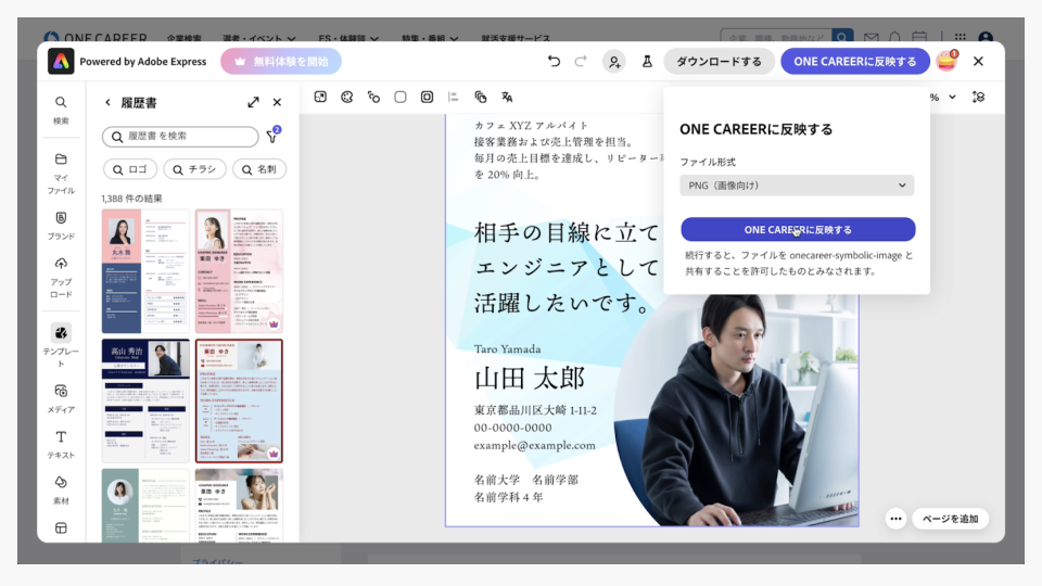 ※ワンキャリアのマイページ上で、豊富なテンプレートで簡単に画像作成ができる「Adobe Express」を活用し、そのまま登録も可能