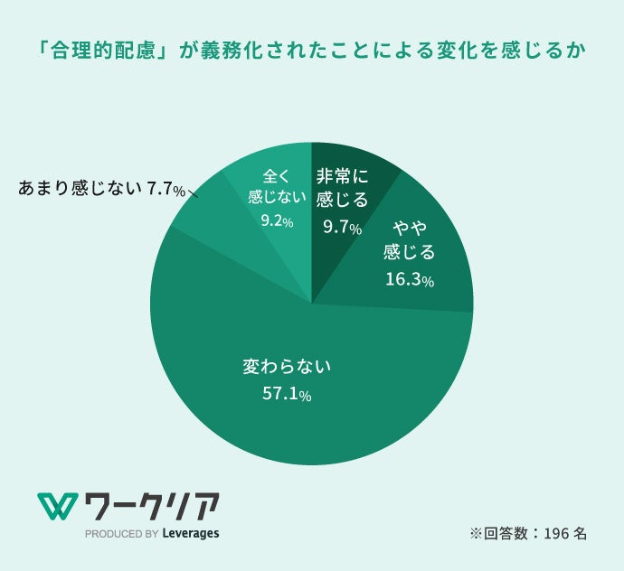 レバレジーズ株式会社が運営する障がい者就労支援サービス「ワークリア」( https://worklear.jp/ )は、2016年4月に民間企業の雇用分野における「合理的配慮の義務化」から10年を迎えることを受け、会社員として勤務している障がい者196名を対象に、障がい者雇用における合理的配慮に関する実態調査を実施しました。