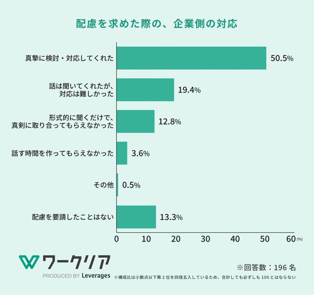 過去に配慮を求めた際の企業の対応に関して、約半数が「真摯に対応してくれた(50.5%)」と回答し、有効な関係を築けていることがわかります。一方で、「形式上だけで真剣に取り合ってもらえなかった(12.8%)」「話すら聞いてもらえなかった(3.6%)」という声も一定数存在し、企業ごとに向き合う姿勢の差が浮き彫りとなりました。