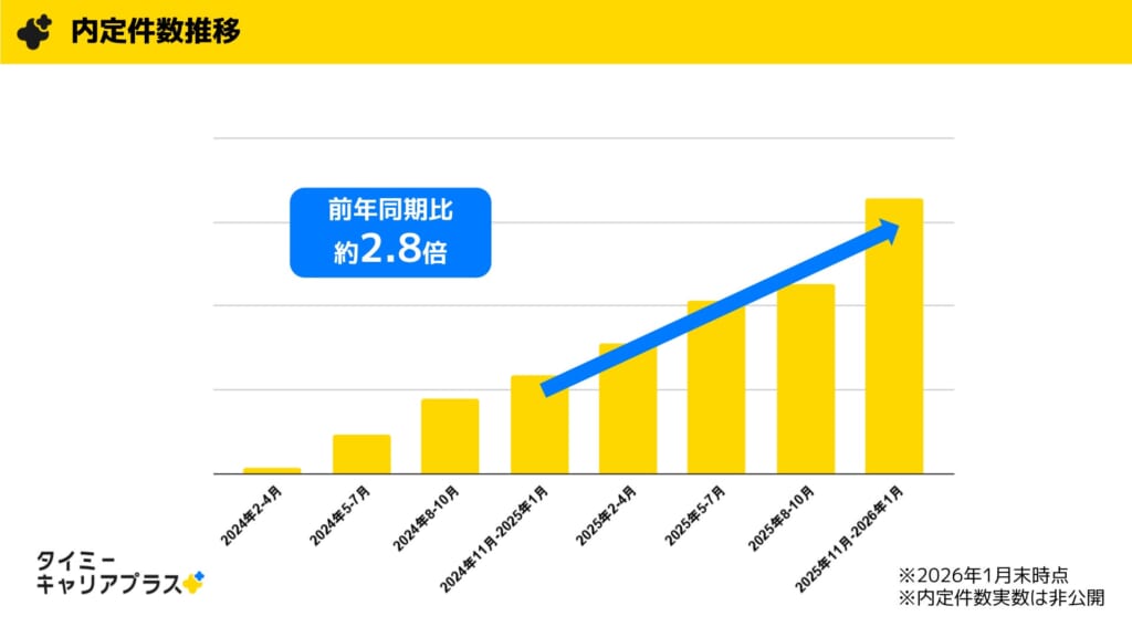 サービス開始以降、内定承諾件数は順調に伸びており、直近2025年11月〜2026年1月は前年同期比で約2.8倍となりました。深刻な人手不足を背景に事業者における正社員採用ニーズが非常に堅調であることや、「タイミー履歴書」機能の追加によりスポットワークでの勤務実績を選考過程でこれまで以上に活用しやすくなったことが、内定承諾件数伸長の要因と考えられます。