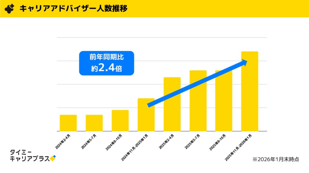 また、増加するニーズに応えるべく社内のキャリアアドバイザーを増員(前年同期比約2.4倍)し、求職者のサポート体制を強化しています。