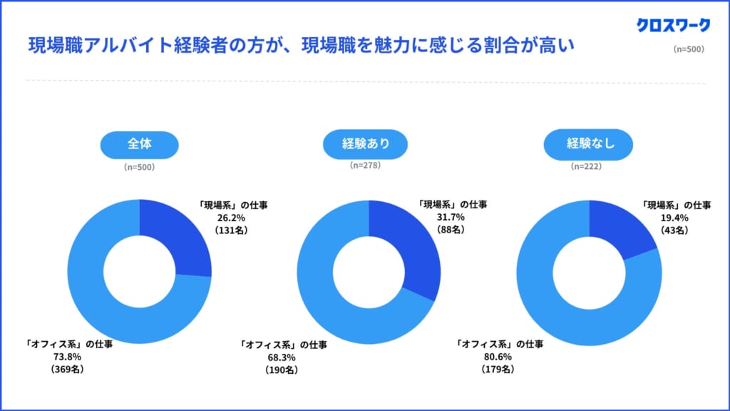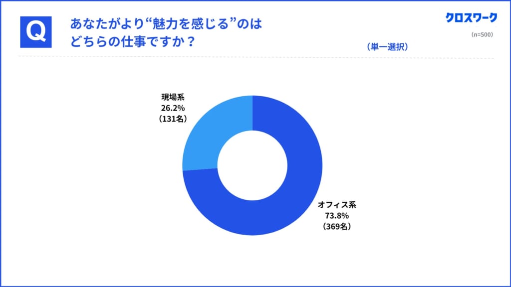 どちらの仕事が魅力に感じるかを聞いたところ、オフィス系の仕事(事務・企画・営業・管理など)が73.8%(369名)、現場系の仕事(製造・建設・物流・インフラなど)が26.2%(131名)となりました。