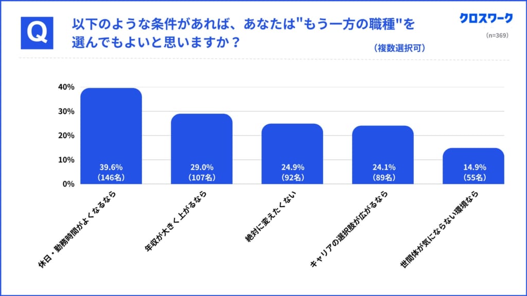 具体的な条件としては、休日や勤務時間などの条件がよくなるなら39.6%(146名)が最多となり、次いで年収が大きく上がるなら29.0%(107名)、キャリアの選択肢が広がるなら24.1%(89名)、世間体が気にならない環境なら14.9%(55名)という順になりました。