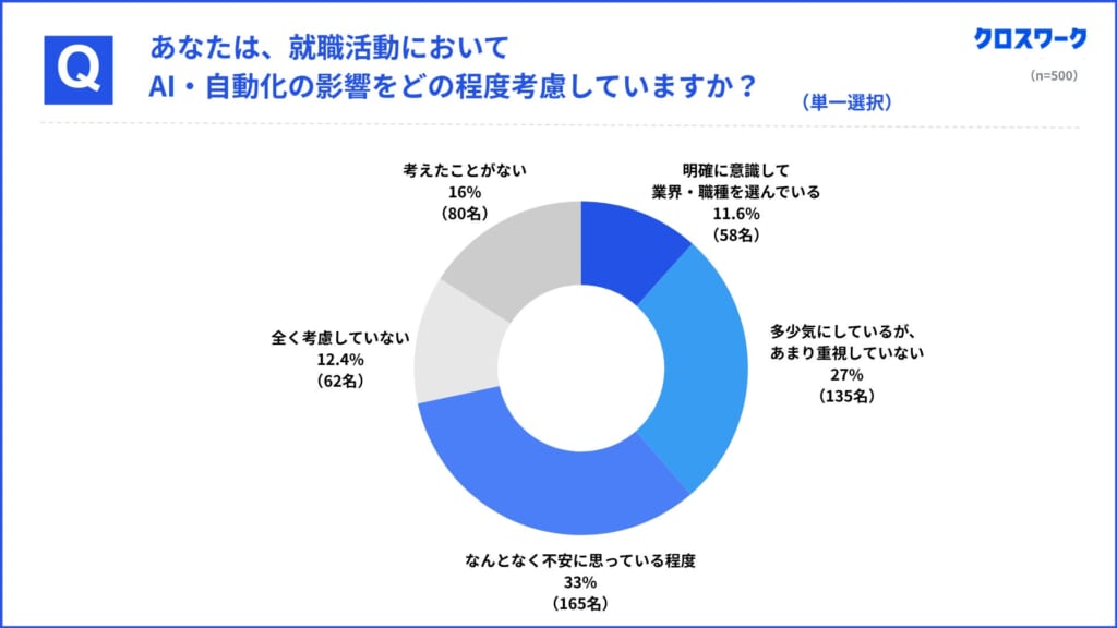 就職活動においてAI・自動化の影響をどの程度考慮しているか尋ねたところ、なんとなく不安に思っている程度33.0%(165名)が最多となりました。多少気にしているが、あまり重視していない27.0%(135名)、明確に意識して業界・職種を選んでいる11.6%(58名)と続き、合わせると、全体の7割以上の学生が、程度はあれど就職活動においてAIの影響を意識していることがわかりました。