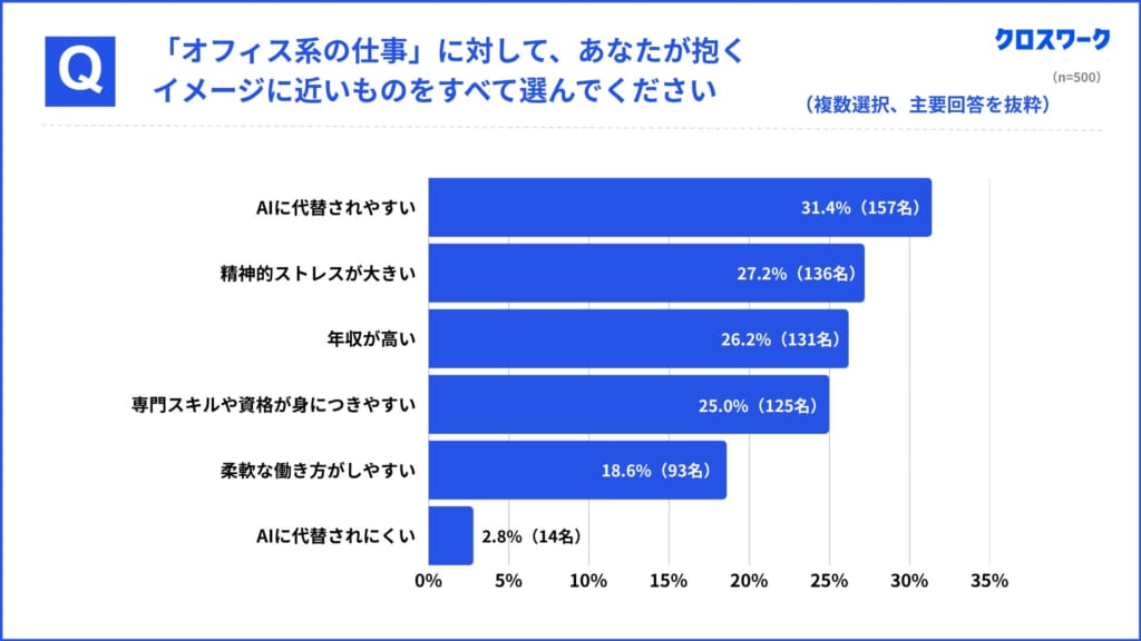 職種に対するイメージを尋ねたところ、オフィス系の仕事では「AIに代替されやすい(31.4%、157名)」が最多となりました。AIに代替されにくいを選んだ人は最下位と、時代を反映する結果となりました。次いで「精神的ストレスが大きい(27.2%、136名)」、「年収が高い(26.2%、131名)」が続いています。