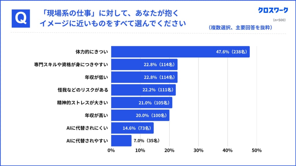 一方で、現場系の仕事は「体力的にきつい(47.6%、238名)」という懸念が最も多く見られました。「専門スキルや資格が身につきやすい(22.8%、114名)」が続き、年収に対してのイメージは「高い(100名)」と「低い(114名)」が拮抗しました。