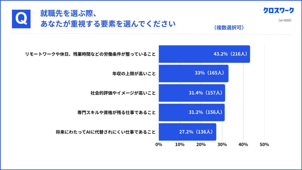 就職先選択においては、リモートワークや休日、残業時間など、労働条件の整備を重視する学生が最も多く、43.2%(216名)でした。