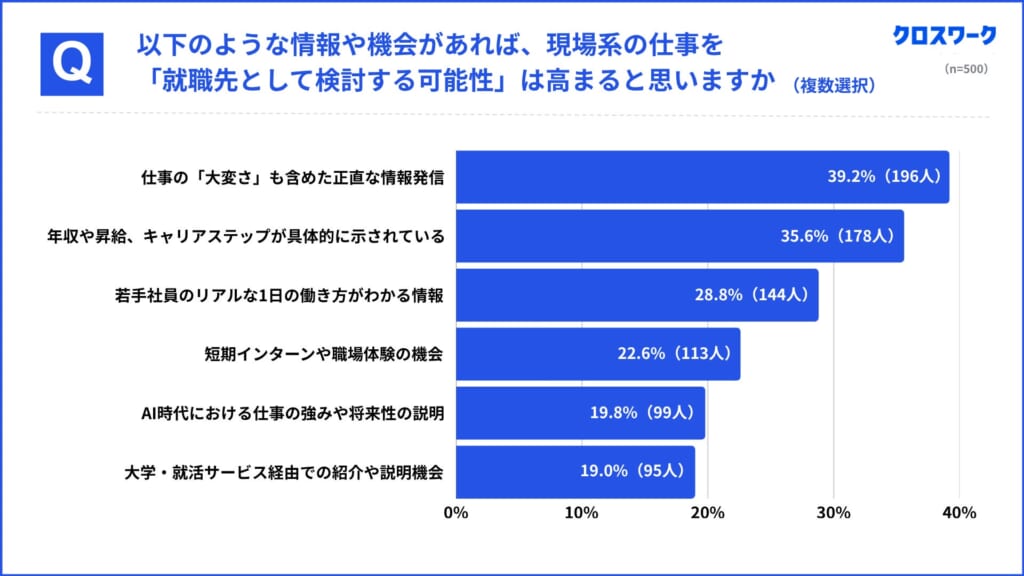 どのような情報や機会があれば現場系の仕事を就職先として検討するかを尋ねたところ、仕事の大変さも含めた正直な情報発信39.2%(196名)が最多となりました。次いで年収や昇給、キャリアステップの具体的な提示35.6%(178名)、若手社員のリアルな1日の働き方がわかる情報28.8%(144名)が続いています。 実態を正しく見せることが、潜在的な現場志望層を掘り起こす鍵となることが示唆されました。
