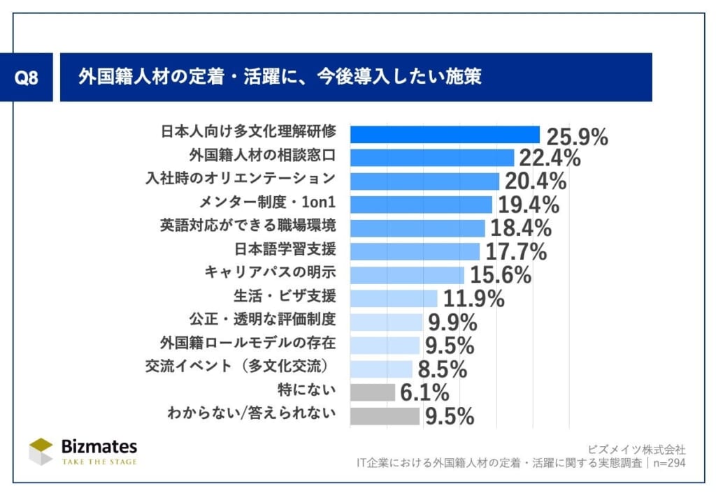 全体として、「文化理解」「心理的安全性」「言語支援」といった”受け入れ側の支援強化”が今後の定着施策の重要なテーマとなっています。