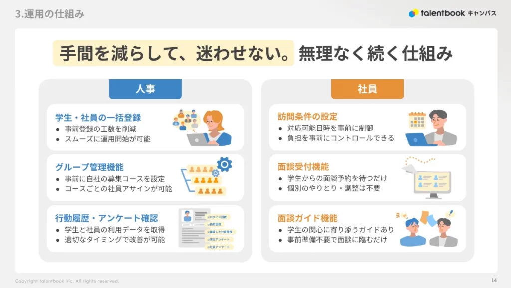 学生・社員の一括登録によって人事の工数を削減し、スムーズな運用開始が可能。募集コースの設定や、コースごとの社員アサイン、さらに行動履歴やアンケートなど学生と社員の利用データを取得することで適切なタイミングで改善が可能となります。社員においては対応可能日時など訪問条件を設定することで負担を事前にコントロールでき、面談受付機能によって、個別のやりとり・調整は不要となります。面談ガイド機能により、事前準備不要で面談に臨むだけです。