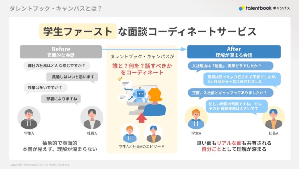 こうした課題を受け、AIが「誰と?何を?話すべきか」をコーディネートする面談コーディネートサービス「タレントブック・キャンパス」を開発しました。学生の関心に合わせて最適な社員を提案し、双方の事前準備をガイドすることで、「話せてよかった」と感じる対話を仕組みとして設計します。