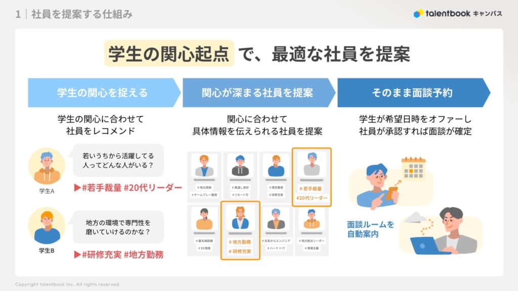 学生の関心に合わせて、AIが「具体情報を伝えられる社員」を提案します。例えば学生Aには「#若手裁量」「#20代リーダー」という関心にマッチした社員を、学生Bには「研修充実」「地方勤務」という関心にマッチした社員をタグづけしてレコメンド。学生が希望日時をオファーし、社員が承認すれば面談が確定するシームレスな日程調整も実現します。