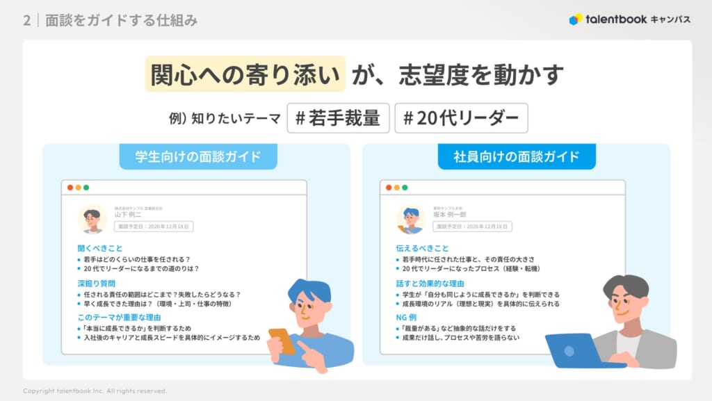 学生の関心と社員のインタビュー内容をもとに、対話のヒントや進め方を提示します。学生向けには「聞くべきこと」「深掘り質問」などを提示し、社員向けには「伝えるべきこと」「話すと効果的な理由」「NG例」などをガイド。関心への寄り添いが、志望度を動かします。