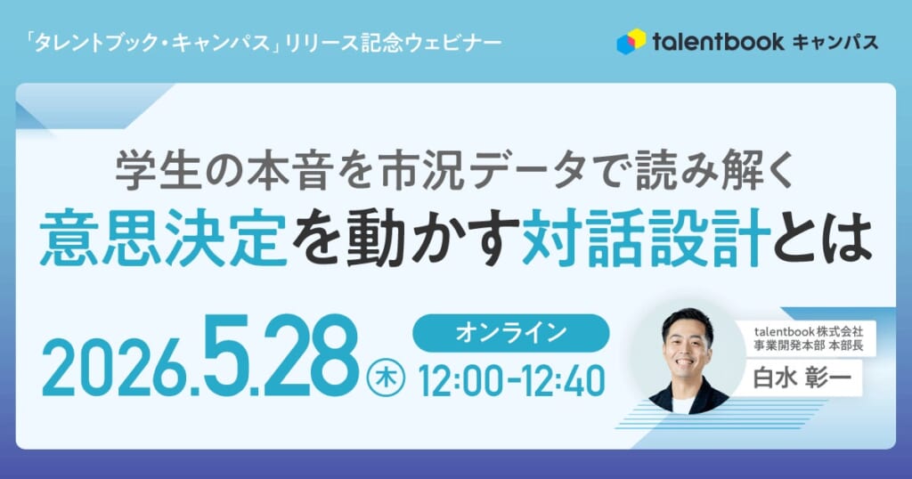「タレントブック・キャンパス」リリースを記念して、2026年5月28日(木)12時よりウェビナーを開催いたします。最新の採用市況データや学生調査の紹介なども交えながら、学生の意思決定を動かす対話設計について具体的に解説します。新サービスについて興味がある方もぜひご参加ください。