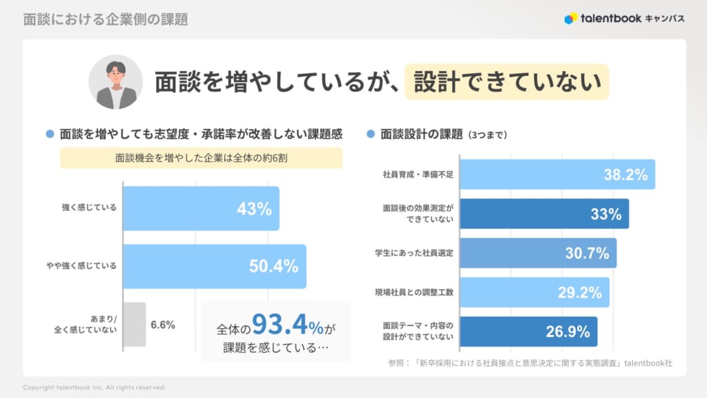 - 面談数を増やした企業の93.4%が「志望度・承諾率は改善しない」と課題を感じている