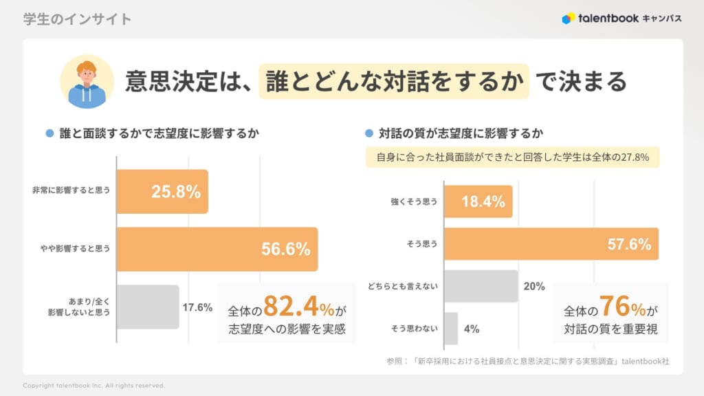 「自分に合った社員と話せる機会があれば志望度に影響する」と回答した学生は82.4%。また、「対話の質が上がれば意思決定がより早く・確実にできた」と振り返る学生は76.0%にのぼりました。
