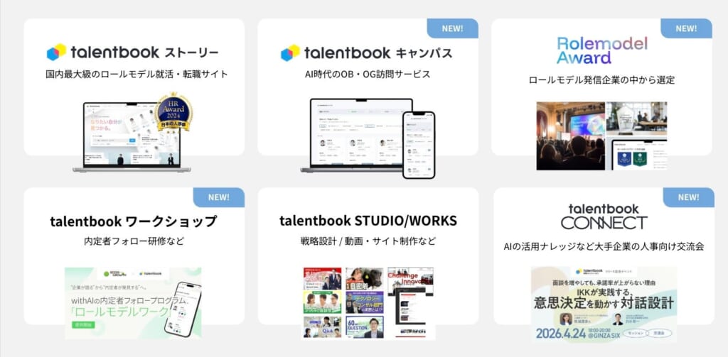年間300万人のZ世代が訪問するロールモデル就活・転職サイト「タレントブック・ストーリー」、AI時代のOB・OG訪問サービス「タレントブック・キャンパス」を運営し、「ロールモデル」を起点にAI時代の新しい採用体験をつくるソリューションを展開しています。2026年12月には国内最大級の「ロールモデルアワード」を開催予定。日経225銘柄企業の20%、累計1,200社の企業支援実績があります。