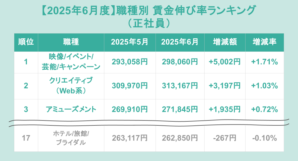 正社員の職種別賃金伸び率ランキング(前月比)トップ3は、1位が「映像/イベント/芸能/キャンペーン」(増加額+5,002円、増加率+1.71%)、2位が「クリエイティブ(Web系)」(増加額+3,197円、増加率+1.03%)、3位が「アミューズメント」(増加額+1,935円、増加率+0.72%)でした。