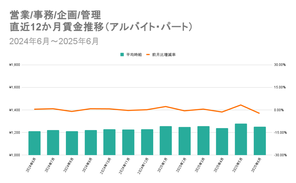 「営業/事務/企画/管理」の平均時給は1,200円以上を維持しながら、目立った増減なく推移しています。