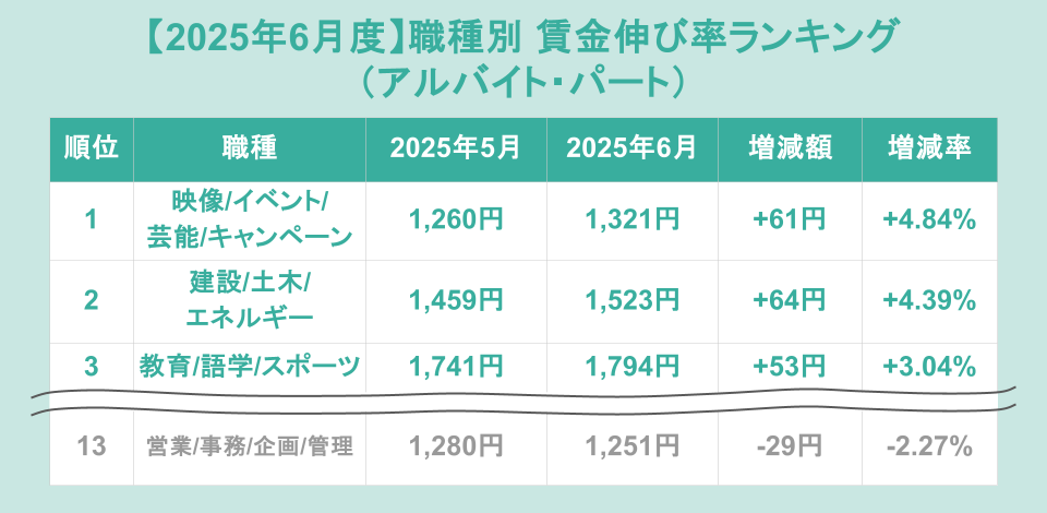 アルバイト・パートの職種別賃金伸び率ランキング(前月比)トップ3は、1位が「映像/イベント/芸能/キャンペーン」(増加額+61円、増加率+4.84%)、2位が「建設/土木/エネルギー」(増加額+64円、増加率+4.39%)、3位が「教育/語学/スポーツ」(増加額+53円、増加率+3.04%)でした。