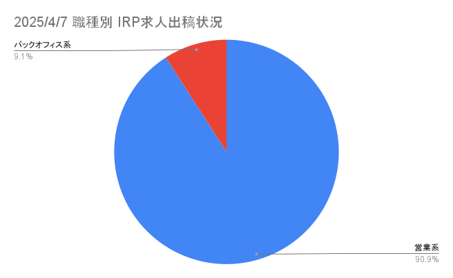 では、IRPはどのような職種を募集しているのでしょうか。リクルートエージェントが移管された影響からか、求人出稿を開始した4月7日時点では、転職希望者へのキャリアカウンセリングや求人提案を行うキャリアアドバイザー職と、企業への採用支援や人材提案を行うリクルーティングアドバイザー職といった営業系職種が90.9%と大半を占めています。