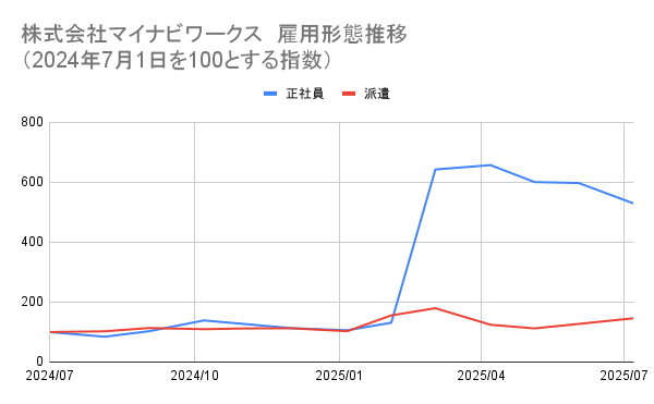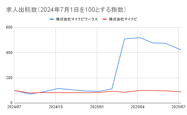次に、株式会社マイナビ(以下、マイナビ)の求人出稿状況を見てみます。同社の求人出稿数は横ばいでしたが、グループ会社で派遣事業を行う株式会社マイナビワークスは大きく出稿数を伸ばしていました。