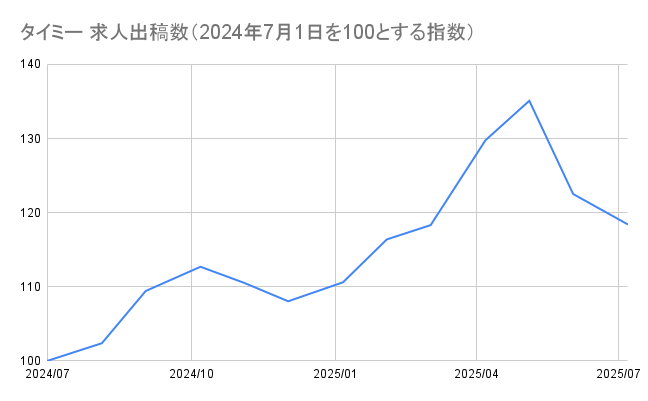 最後に株式会社タイミーの求人出稿状況を見てみると、求人数は1年間で約1.3倍にまで増加。2024年7月26日の上場後も企業規模拡大の手を緩めていないことが伺えます。