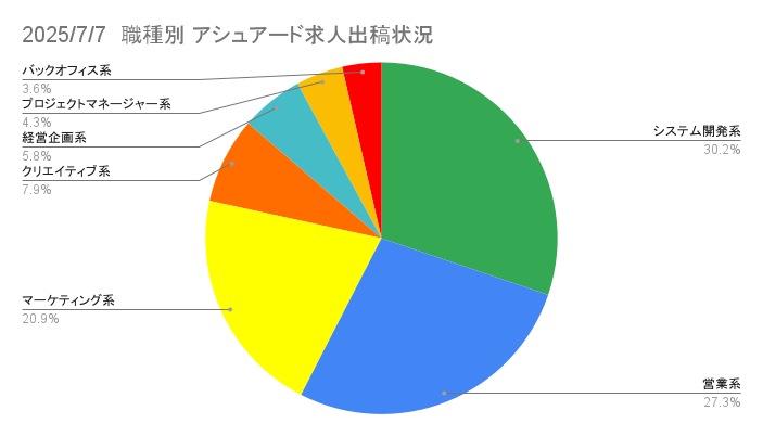 職種で見てみると、2024年7月1日時点では、発表通りシステム開発系の職種が44.1%と大半を占めていました。一方、2024年7月1日時点では5.6%だった営業系の職種が、2025年7月7日時点では31.3%と25.7ポイント増加。